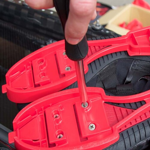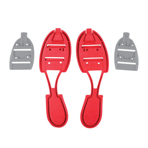 The full QuickRelease system comes with a pair of grey BasePlate cleats and a pair of red ShoePlate Tops.