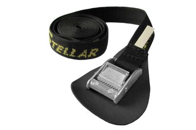Boat strap with cam buckle designed to secure rowing skiffs and kayaks to roof racks or trailers for transport.
